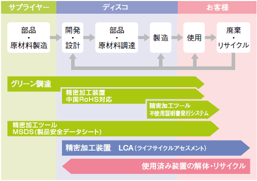 ディスコでは、製品のライフサイクルにおける環境負荷をできるかぎり低減した製品づくりを進めています。調達から廃棄まで一貫したコンセプトで環境に配慮し、省エネルギー化や有害化学物質の削減・代替に努めています。