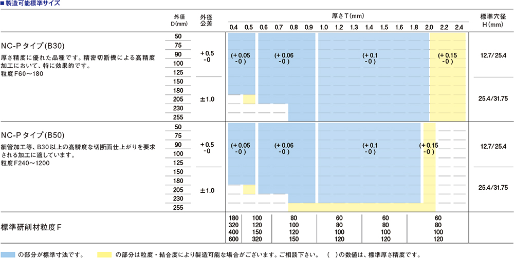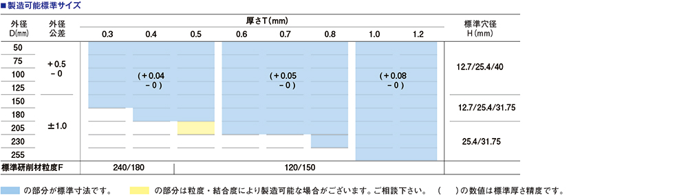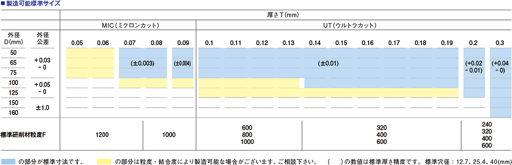 厚さ0.1mm未満のミクロンカット「MIC」と、厚さ0.1mm以上のウルトラカット「UT」を規格しています。ダイヤ入り砥石も製造可能です。