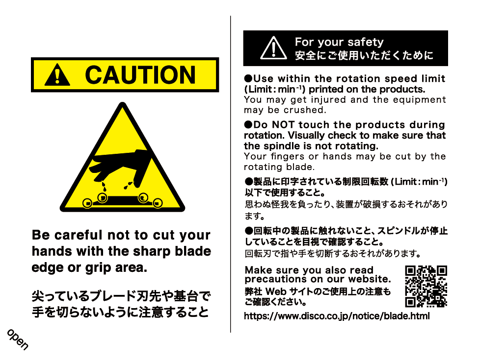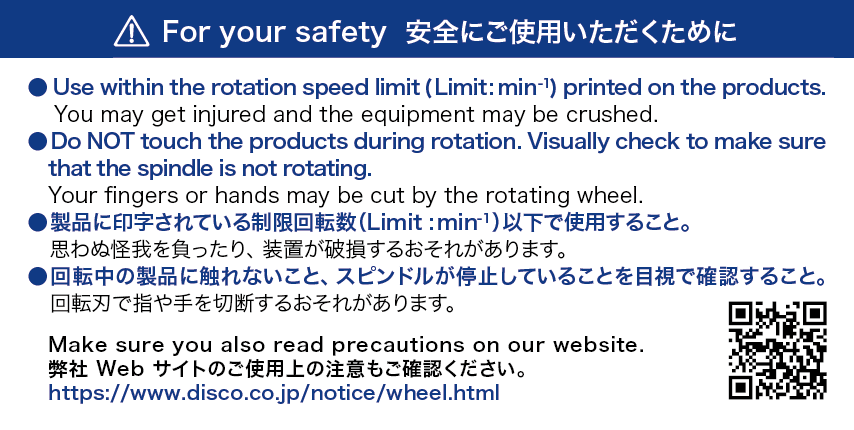 ブレード、ホイール(以下、精密加工ツール)は、装置セットアップ時のアイドリング(空回し)において過度に高速回転させた場合、破損して人体や装置を傷つける可能性があります。こうしたトラブルを未然に防ぐため、精密加工ツールに印字された「制限回転数」を必ず守ってください。